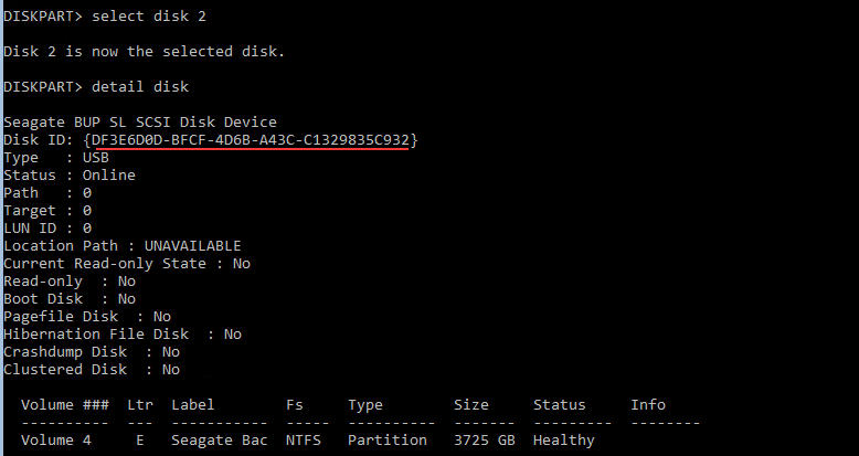detail disk # 查看磁盘详细信息,确认 DiskGUID 是否匹配