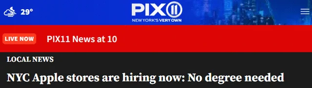 目前,纽约市苹果零售店的多个岗位正在招聘,这些岗位均无学历要求。