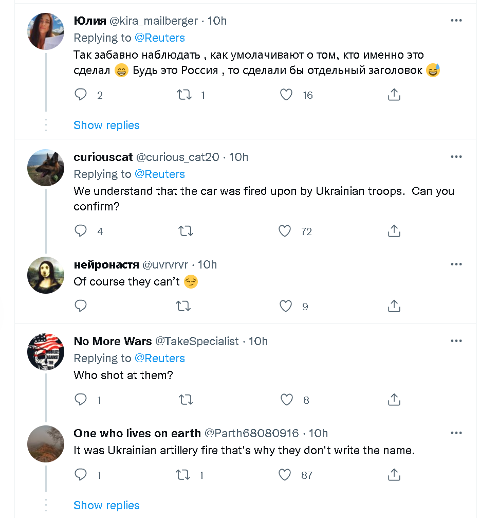 这一消息也令境外社交网络上支持俄罗斯的账号认定炸伤两名路透社记者的是乌克兰军方。