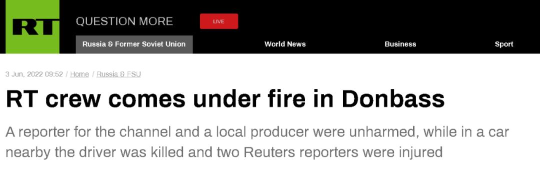 当地时间6月3日,俄罗斯方面传出消息,称在乌克兰东部前线报道俄乌冲突的两名英国路透社记者乘坐的车辆遭到炮弹袭击,导致这两名记者受伤,两人的司机当场死亡。