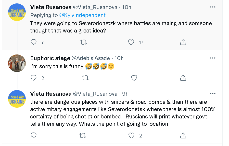 一个支持乌克兰的外国网民则质问这两名记者为什么要跑到战斗正在进行的前线去报道,称记者在那里大概率会遭遇中枪或被炸的情况,然后就会被俄罗斯方面炒作。