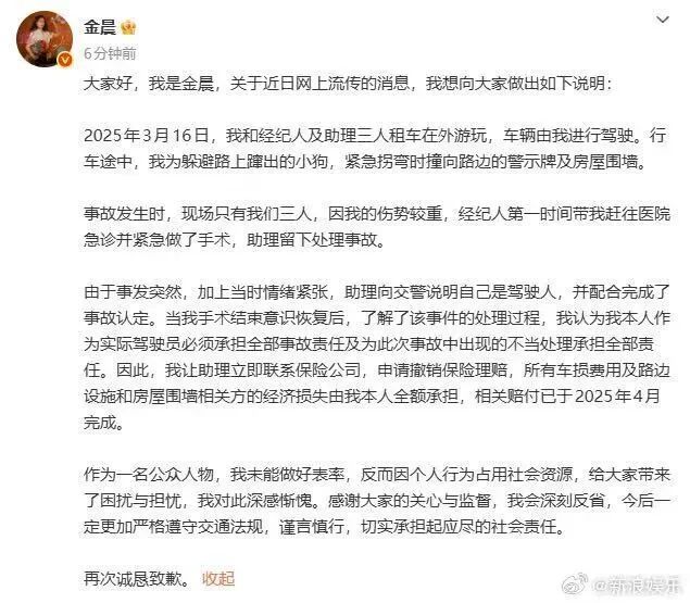 车祸顶包是真的,但金晨只为“占用社会资源”道歉