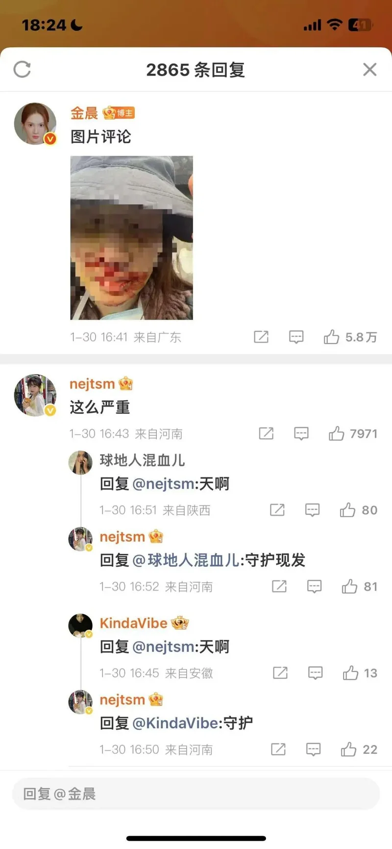 通报称车内三人“轻微伤”。金晨的鼻部伤口有图为证。那么,同在车内的助理徐某青和经纪人刘某祎呢?他们的“轻微伤”是什么?
