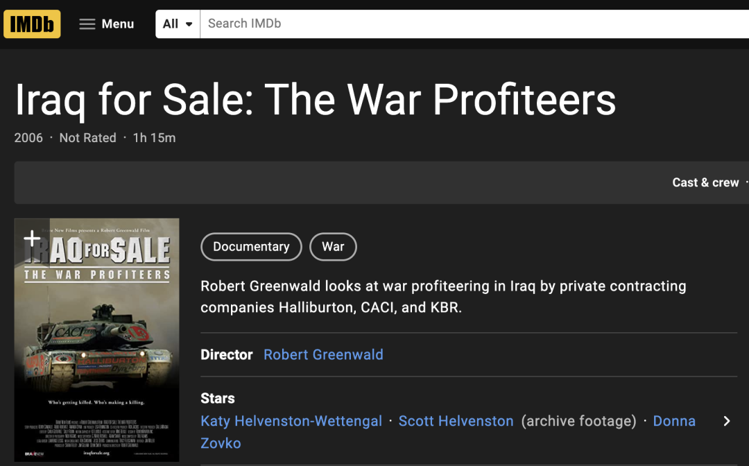这看似一场两国人民双输的战争,那么是谁从这场战争中获益?是谁不愿让战争结束呢?美国导演罗伯特·格林沃尔德拍摄于2006年的纪录片《出售伊拉克:战争奸商》,用大量第一手访谈资料和翔实的数据为人们解开这一疑惑。