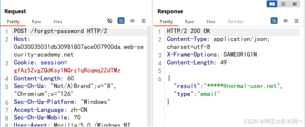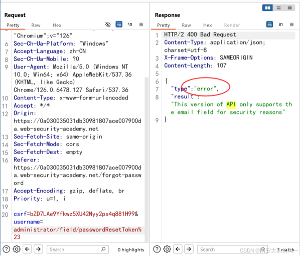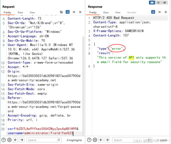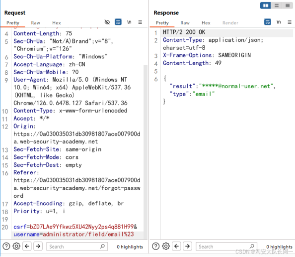 发送请求。注意到返回了原始响应(响应包中可以获得添加的参数值,且返回值 200)。这可能表明服务器端应用程序识别了注入的 field 参数,并且 email 是一个有效的字段类型。