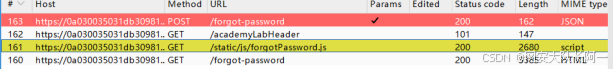2、 在 Proxy > HTTP history 中,注意到 POST /forgot-password 请求和相关的 /static/js/forgotPassword.js JavaScript 文件。