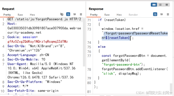 3、 在 Proxy > HTTP history 中,查看 /static/js/forgotPassword.js JavaScript 文件。识别密码重置端点,它引用了 passwordResetToken 参数:
