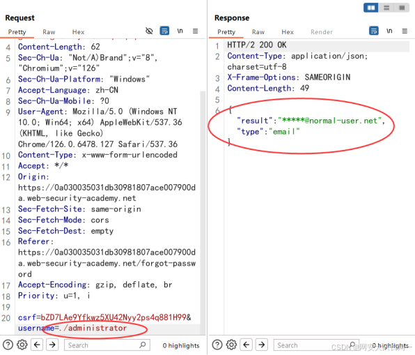 3. 将 username 参数的值从 administrator%3F 改为 ./administrator,然后发送请求。注意到这返回了原始响应。这表明请求可能访问了与原始请求相同的 URL 路径。这进一步表明输入可能被放置在了 URL 路径中。