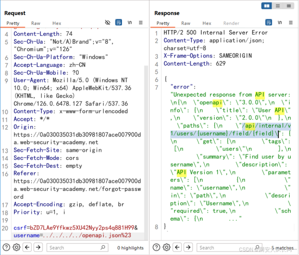 - 将 URL 编码的 administrator# 作为 username 参数的值提交。注意到返回一个 Invalid route 错误消息。这表明服务器可能将输入放置在了服务器端请求的路径中,并且片段截断了一些尾随数据。观察到消息还提到了一个 API 定义。
