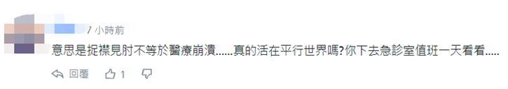还网友人称,“(陈时中的)意思是捉襟见肘不等于医疗崩溃。。。。。。真的活在平行世界吗?你下去急诊室值班一天看看”。↓