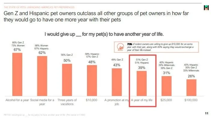 而且越是年轻,就越是宠自家毛孩子。在一项调查中,高达51%的Z世代表示,如果能让宠物多活一年,愿意放弃自己一年的生命。