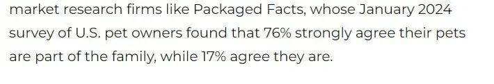 根据2024年的一项调查,高达76%的宠物主人“强烈同意”宠物是家庭的一员,17%表示“同意”,加起来一共是92%。