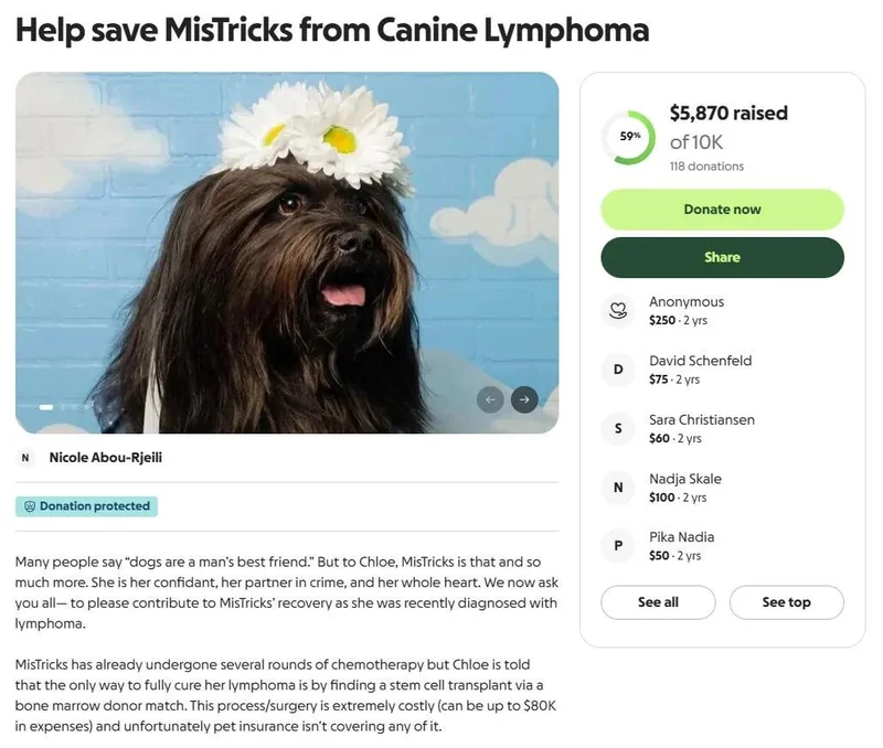医生告诉她,彻底治愈淋巴瘤的唯一方法是找到匹配的骨髓,进行干细胞移植,但这个过程极其昂贵,可能高达8万美元,而她的宠物保险覆盖不了任何费用。