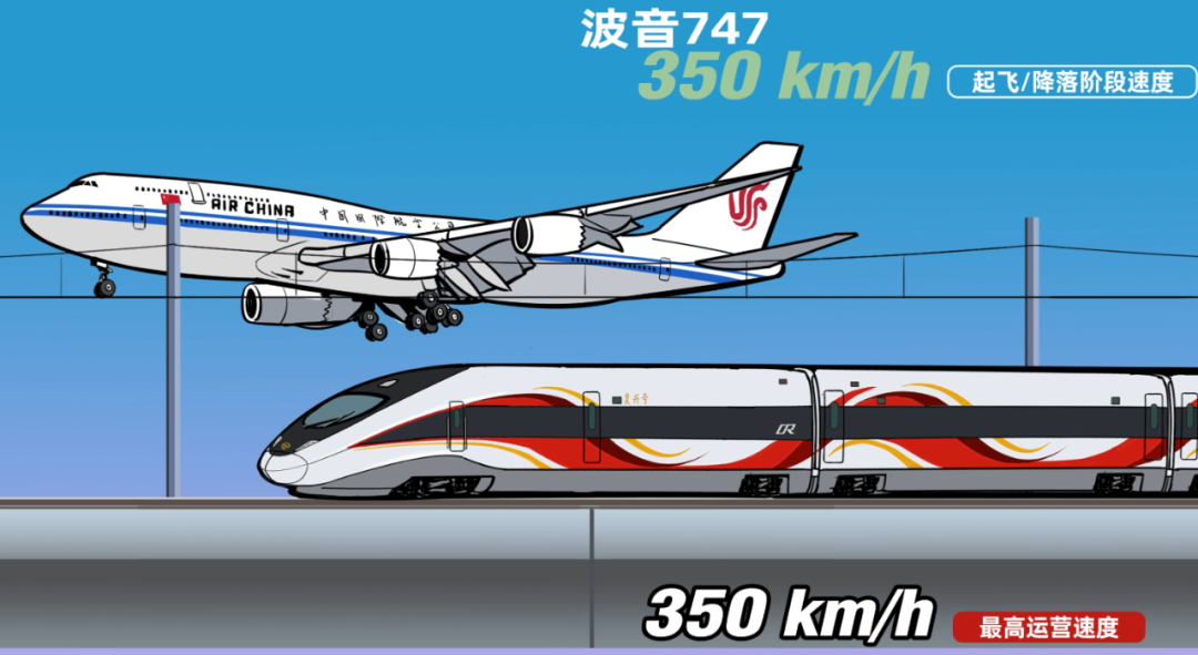 目前高铁的最高运营时速为350公里,虽然追不上巡航时的喷气式飞机,但起飞离场和进近降落时还是能相较高下。