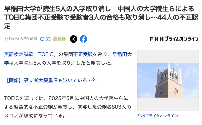 这可不是平时小打小闹的课堂抄袭。这次事件的源头,是日本警方破获了一个有组织、有规模的TOEIC(托业)考试作弊团伙。根据日本媒体的调查,这个团伙运作近两年,手段堪称“特工级别”:有的找枪手代考,有的在考场内外用隐蔽的电子设备传答案,涉及的无效成绩竟然高达803份。更扎眼的是,很多凭着这些“水分成绩”申请日本大学院(研究生院)的人,就这么混了进去,其中就包括了早稻田。