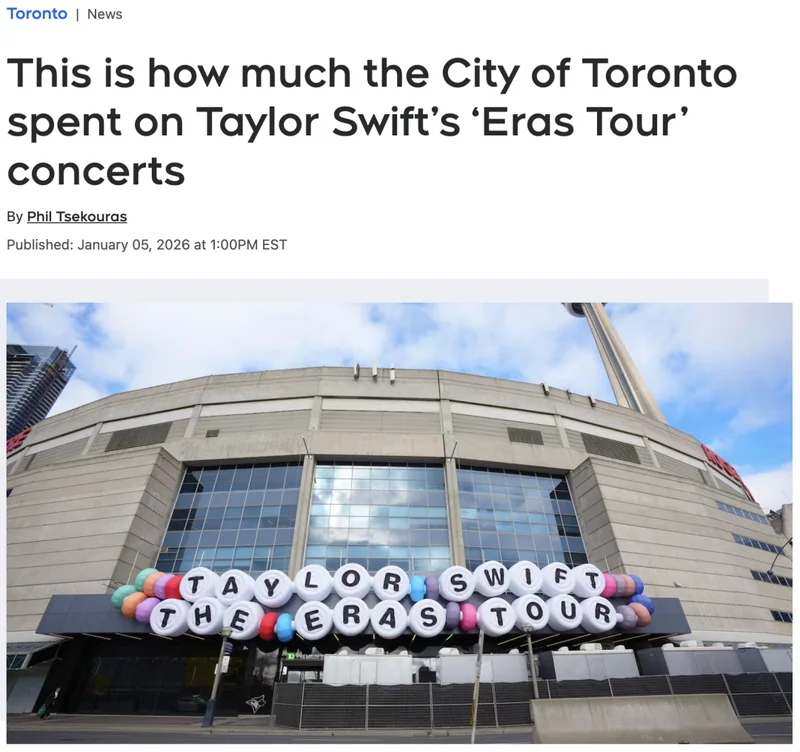 “霉霉”(泰勒·斯威夫特,Taylor Swift)去年 11 月在多伦多连开 6 场《时代巡回演唱会》(The Eras Tour),场场售罄,万人空巷。但这场全球瞩目的音乐盛宴,对多伦多来说,并不只是舞台灯光和粉丝尖叫,背后还有一笔不小的公共支出。