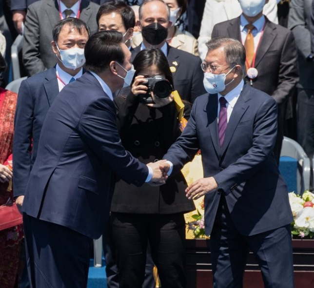 就职典礼结束后,文在寅与尹锡悦握手分别(韩联社)