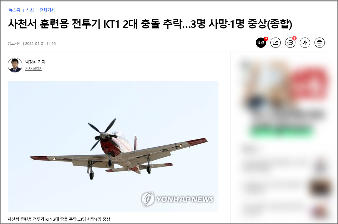 原标题:韩国空军两架初级教练机空中相撞坠毁,机上3死1重伤