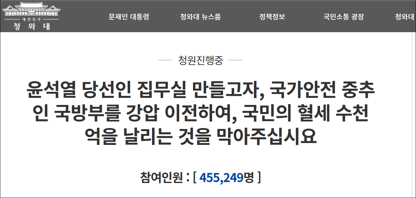 在22日的国会国防委员会全体会议上,国防部提交报告称,总统府迁址计划公布6天前国防部才接到通报。为总统府入驻腾出办公楼至少需要4周左右的时间,总统职务交接委还要求国防部摸索方案,尽可能利用现有办公楼,不租赁民间写字楼或新建楼宇。