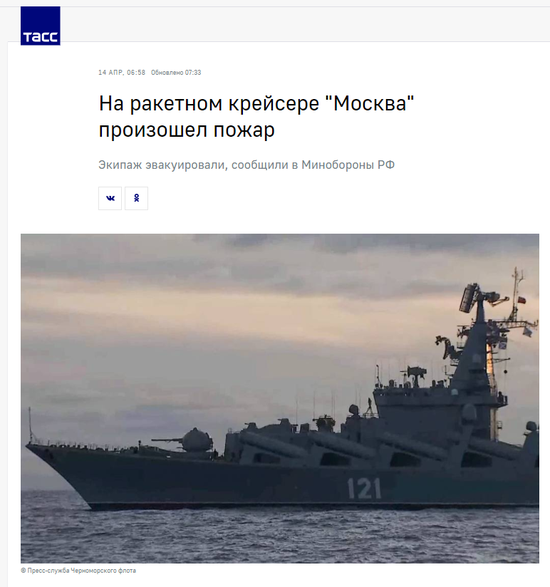 2022年4月14日7时许,据俄罗斯官方媒体塔斯社称,黑海舰队的巡洋舰“莫斯科”号因火灾引起的弹药爆炸而严重受损。塔斯社援引军方说法称,“该舰严重受损,舰员已经完全疏散”(Корабль получил серьезные повреждения。 Экипаж полностью эвакуирован)。
