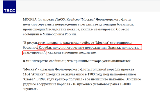 一般来说,关于俄军战舰被击中的消息,此前曾多次出现,但很少会在短时间内被证实。但在乌克兰公布这一战果后仅一天时间,俄罗斯官方媒体就证实了“莫斯科”号巡洋舰受到重创的消息。