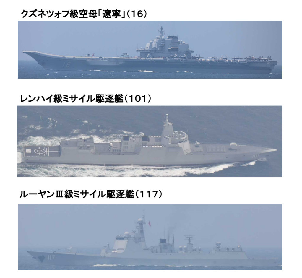 日方称,当地时间5月1日中午12时左右,日本海上自卫队在男女群岛以西约350公里处海域发现了中国海军航母辽宁舰(舷号16)、055型导弹驱逐舰南昌舰(舷号101)、052D型驱逐舰西宁舰(舷号117)、乌鲁木齐舰(舷号118)、成都舰(舷号120)和综合补给舰呼伦湖舰(舷号901)。