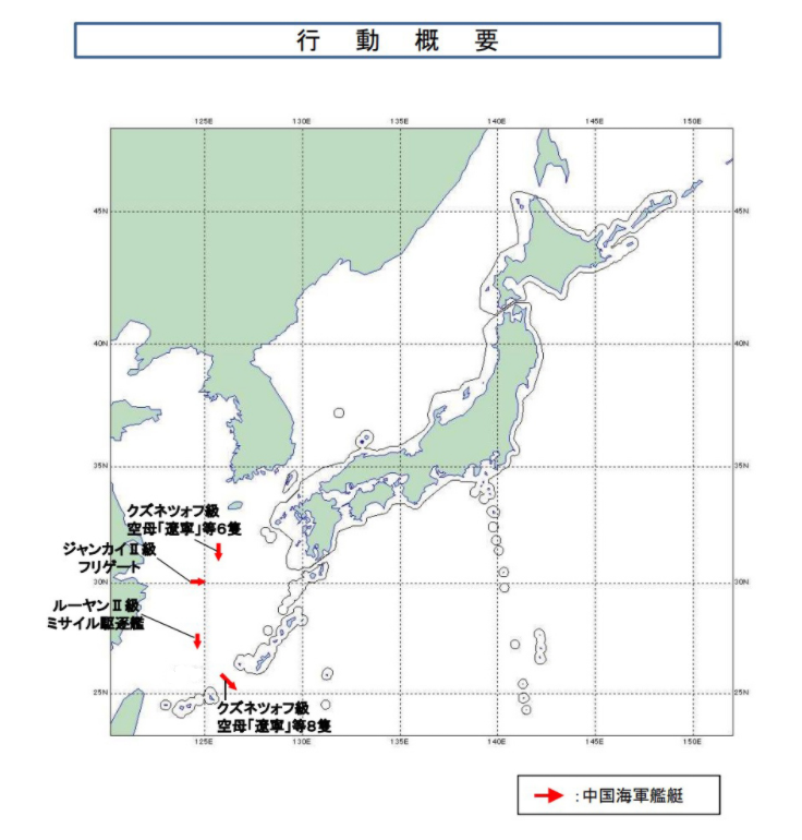 作为应对,日本自卫队出动了准航母“出云”号、海自第四航空群的P-1巡逻机、海自第五航空群的P-3C巡逻机执行跟踪监视和警戒任务。