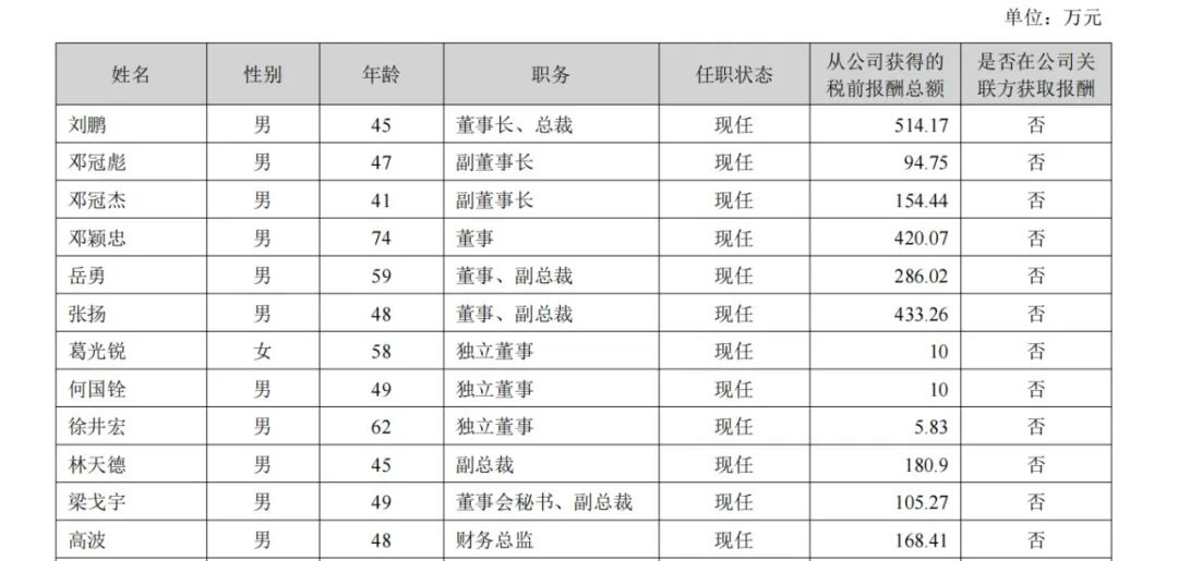 刘鹏2024年年薪514.17万元,虽较上年缩水近百万元,依然排在董监高团队之首,甚至比邓本人还多95万余元。