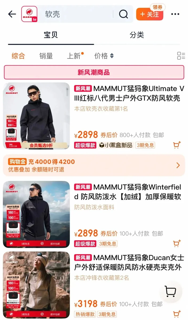 对比始祖鸟动辄2500元以上的硬壳冲锋衣,猛犸象精准踩中了中产的“体面阈值”,线上主力价锁在1000-3000元。
