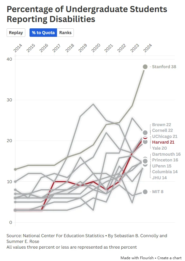 这在顶尖院校更引人注目。2024年,哈佛大学21%的本科生获得了残疾便利措施。过去十年,这比例增长了15%。布朗大学、康奈尔大学和耶鲁大学等顶尖学府,也保持着基本持平的残障水平。有些高校的数据格外显著,如斯坦福大学有38%的学生登记为残障人士,阿默斯特学院则有34%。