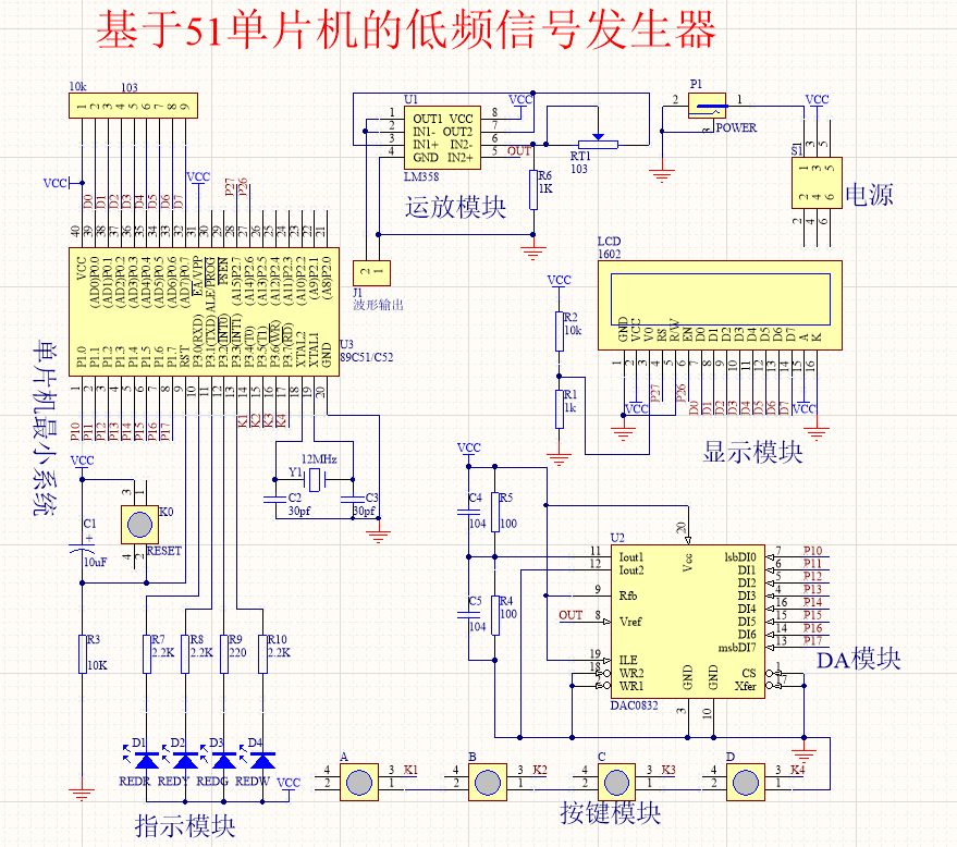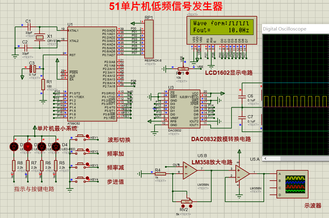 由51单片机+DAC0832模块+按键模块+LM358模块+LCD1602显示模块+电源模块构成