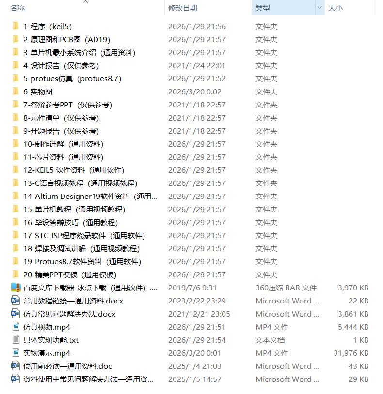 全部资料包括原理图和PCB源文件(AD19)、程序(Keil5)、protues仿真(protues8.7)、设计报告(仅供参考)、仿真视频、开发资料、仿真视频、单片机最小系统介绍等,全网最全!资料内容如下图所示!!