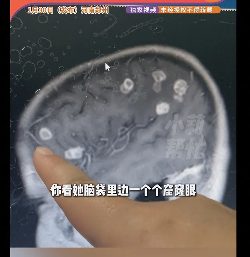 “一个个窟窿眼,大概20几个!非常罕见。”医生指着影像解释道,“这是烟曲霉感染导致的脑组织破坏。”