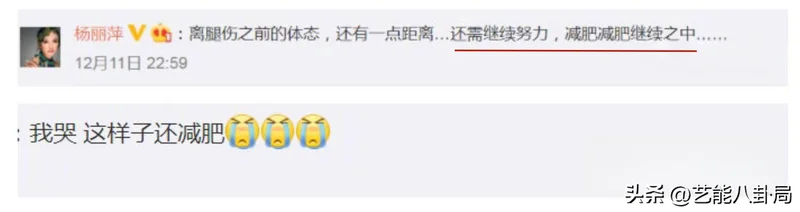 没想到,杨丽萍在评论区的回复却是,“还需继续努力,减肥减肥继续之中……”