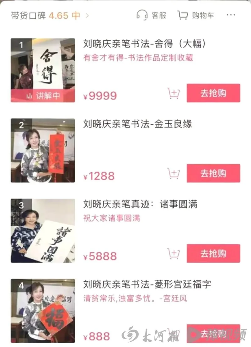 2月1日晚,大河报·豫视频记者注意到,75岁的著名演员刘晓庆现身直播间,镜头前她展纸挥毫,现场创作并售卖个人书法作品,因“亲笔字画”的定价再度引发网络热议:单“福”字售价1088元,四字作品如“平安喜乐”“紫气东来”标价高达3999元。直播现场:边写边卖,“庆姐亲笔”成招牌直播间里,刘晓庆专注书写,一旁的工作人员则熟练地引导下单:“喜欢哪幅直接拍!定制内容可以备注,庆姐下播后亲自写,全程会给大家录视频!”工作人员强调,所有作品均会盖章、装裱后成品发出,并称:“过年将庆姐的字挂在家里中堂,很有排面。”