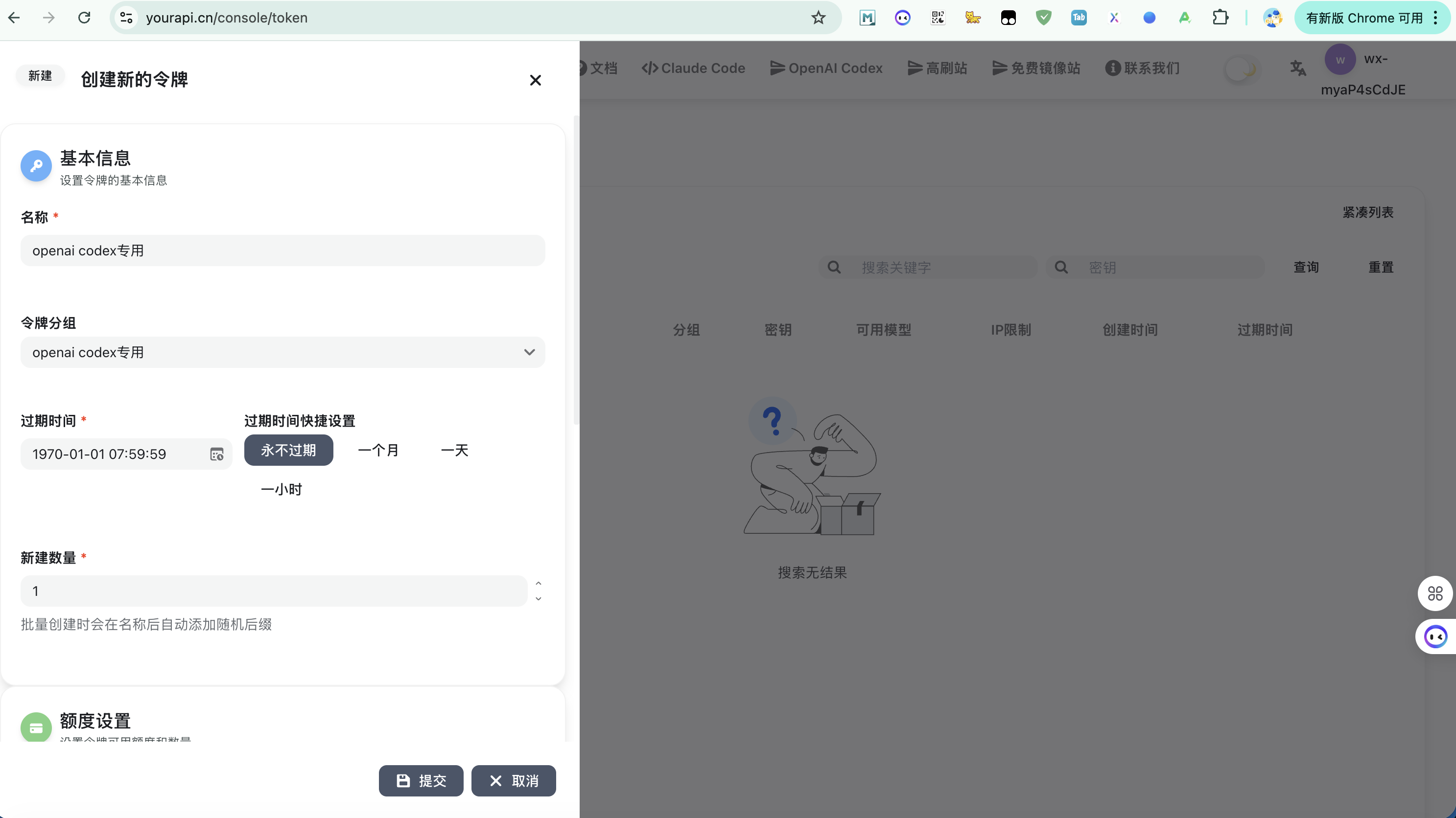 - 令牌分组请选择:openai codex专用(务必选择此分组,否则无法使用)