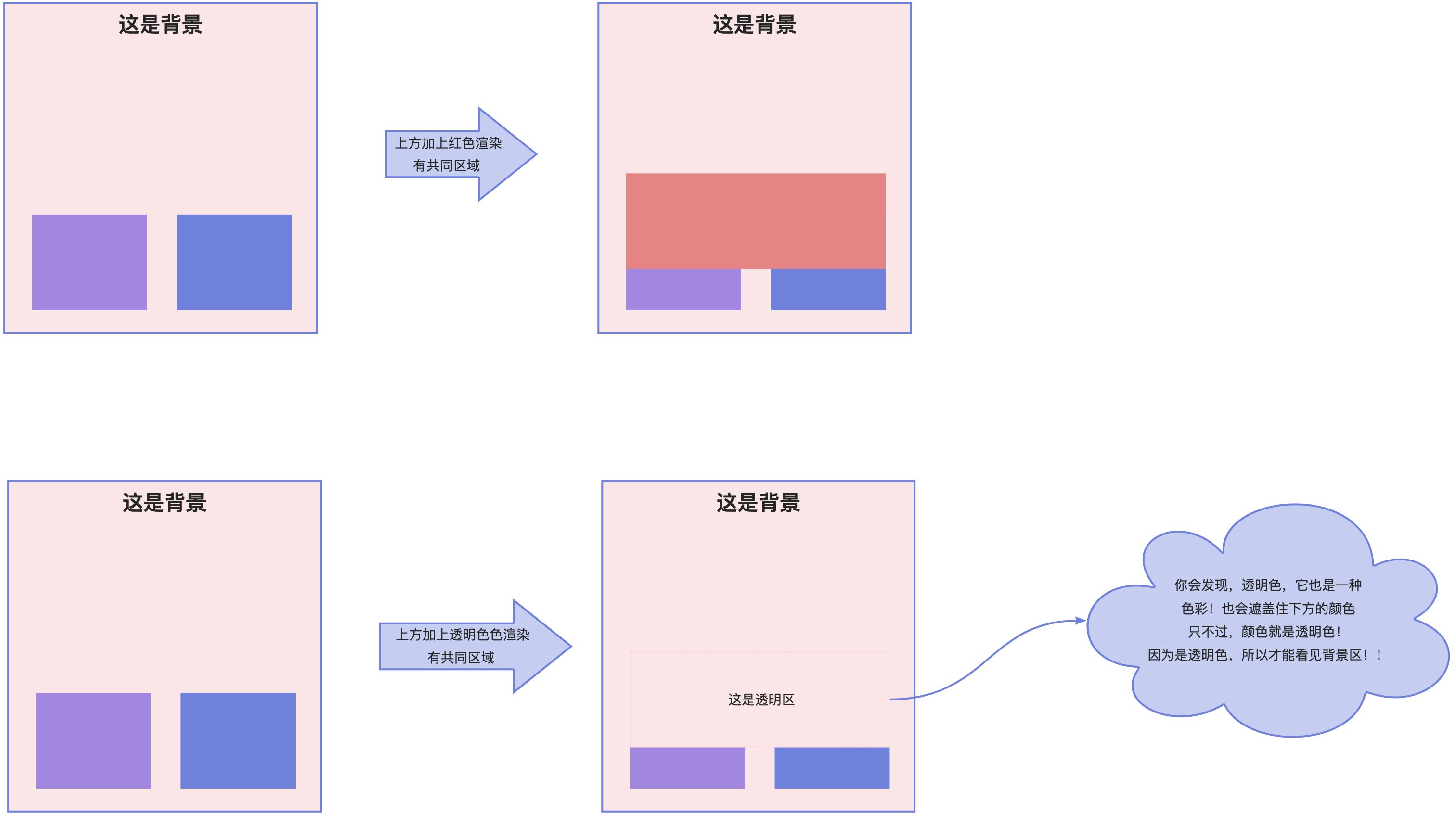 是的,透明色也是一种颜色, 也存在遮盖,这段内存区域就是被设置成了透明#00000000。因为是透明,所以在最终的合成的时候,OpenGL直接把这段内存表示的区域,和视界后面那层的内存内容这么一合成,诶? 就是背景色!