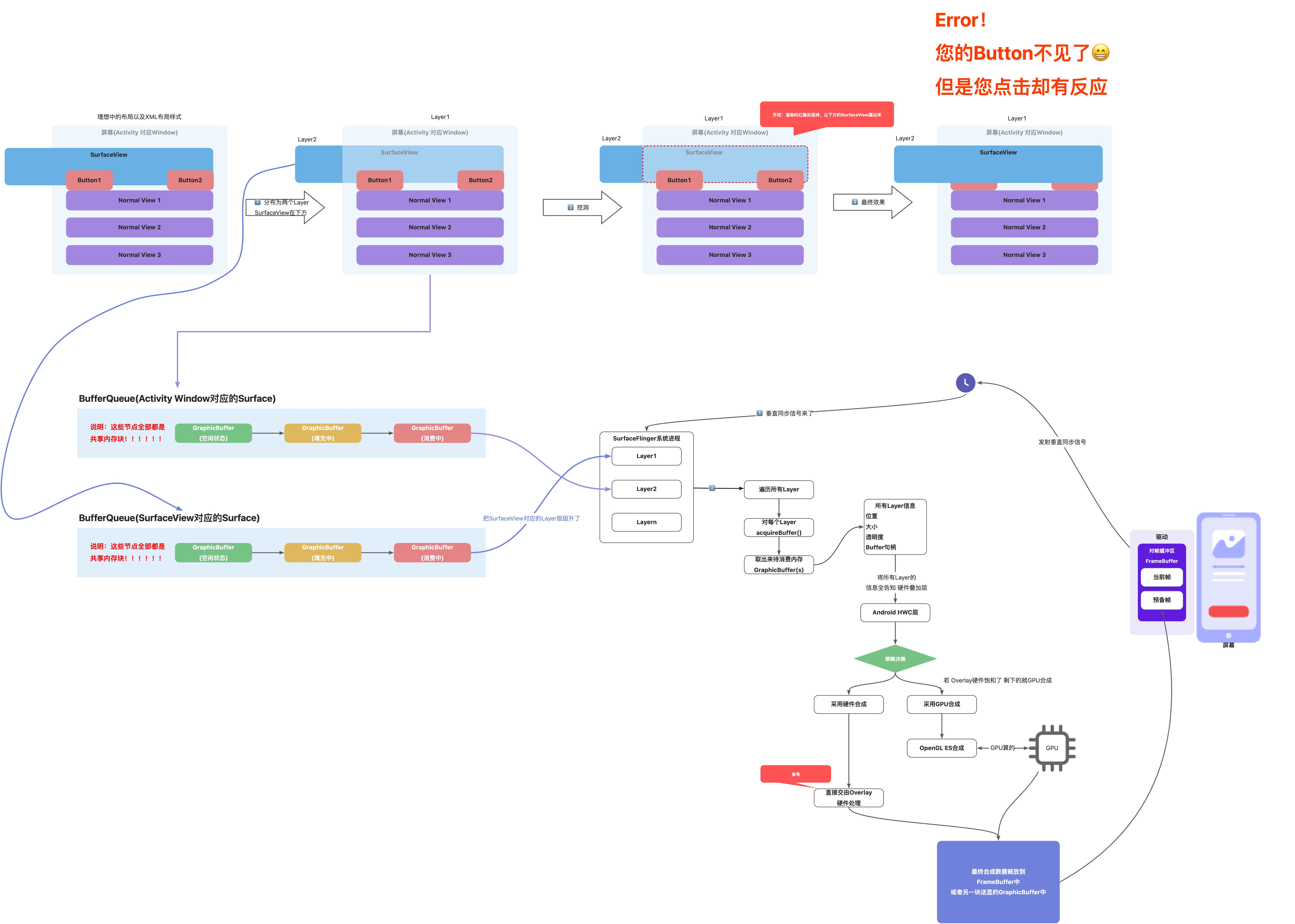 - 无法直接截图。首先是因为它逃逸了编舞者体系,不能直接用View的截图能力。其次,由于SurfaceView单开了BufferQueue, 拿到这种特殊队列的数据,我们既没有线程的API,也没有相关权限。这都是受保护的缓冲区。