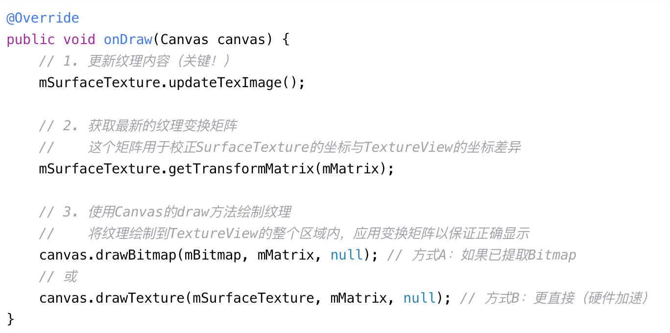 - Camera将数据填充后,通知TextureView相关类,告知数据准备完毕