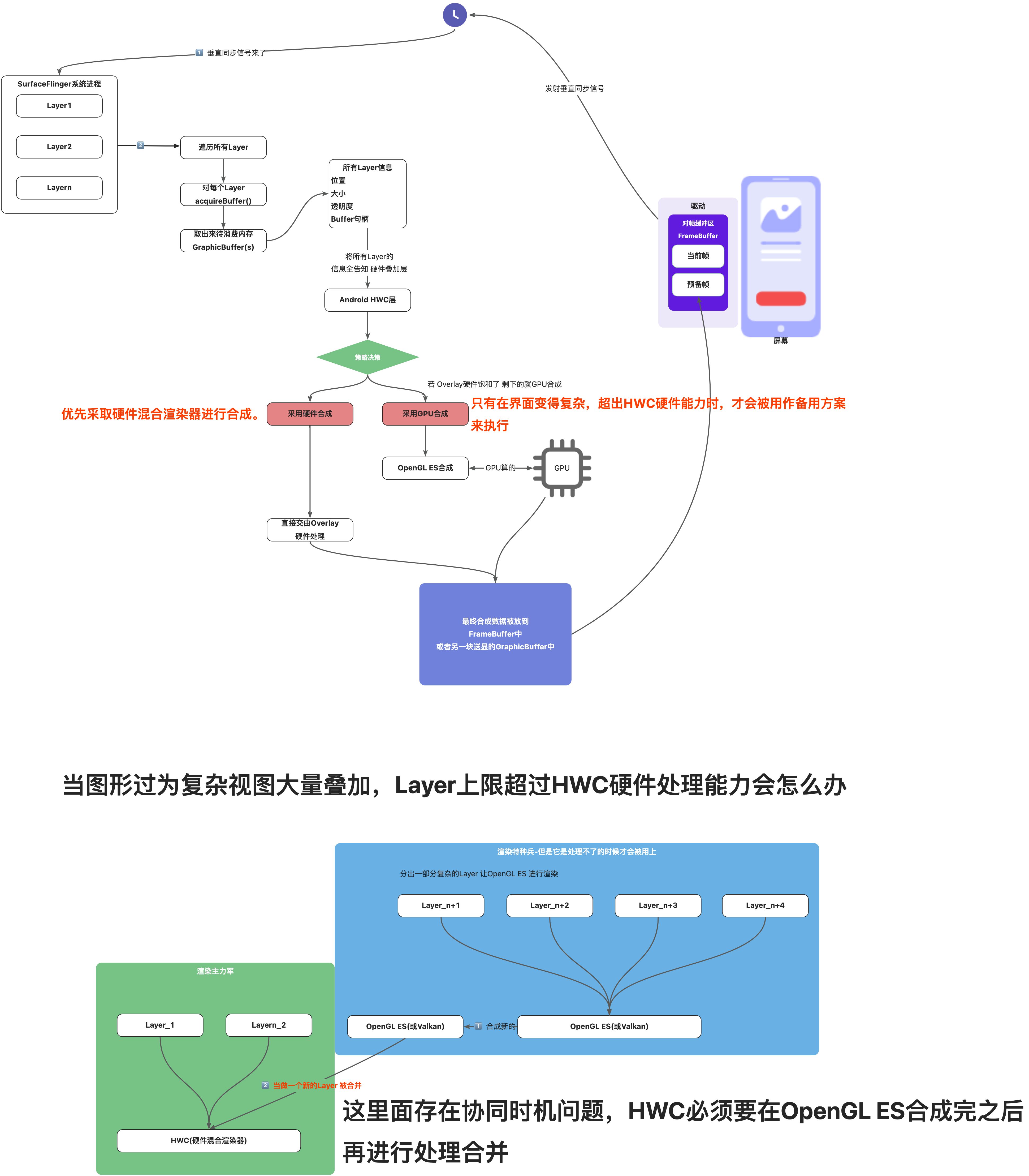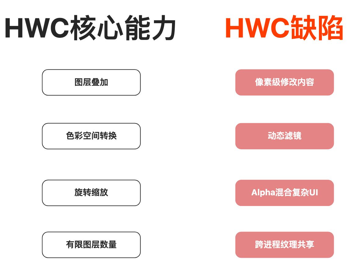 为什么要区分呢? 都走硬件混合渲染器不就得了? 原因在于HWC 与 OpenGL各自能力的特点