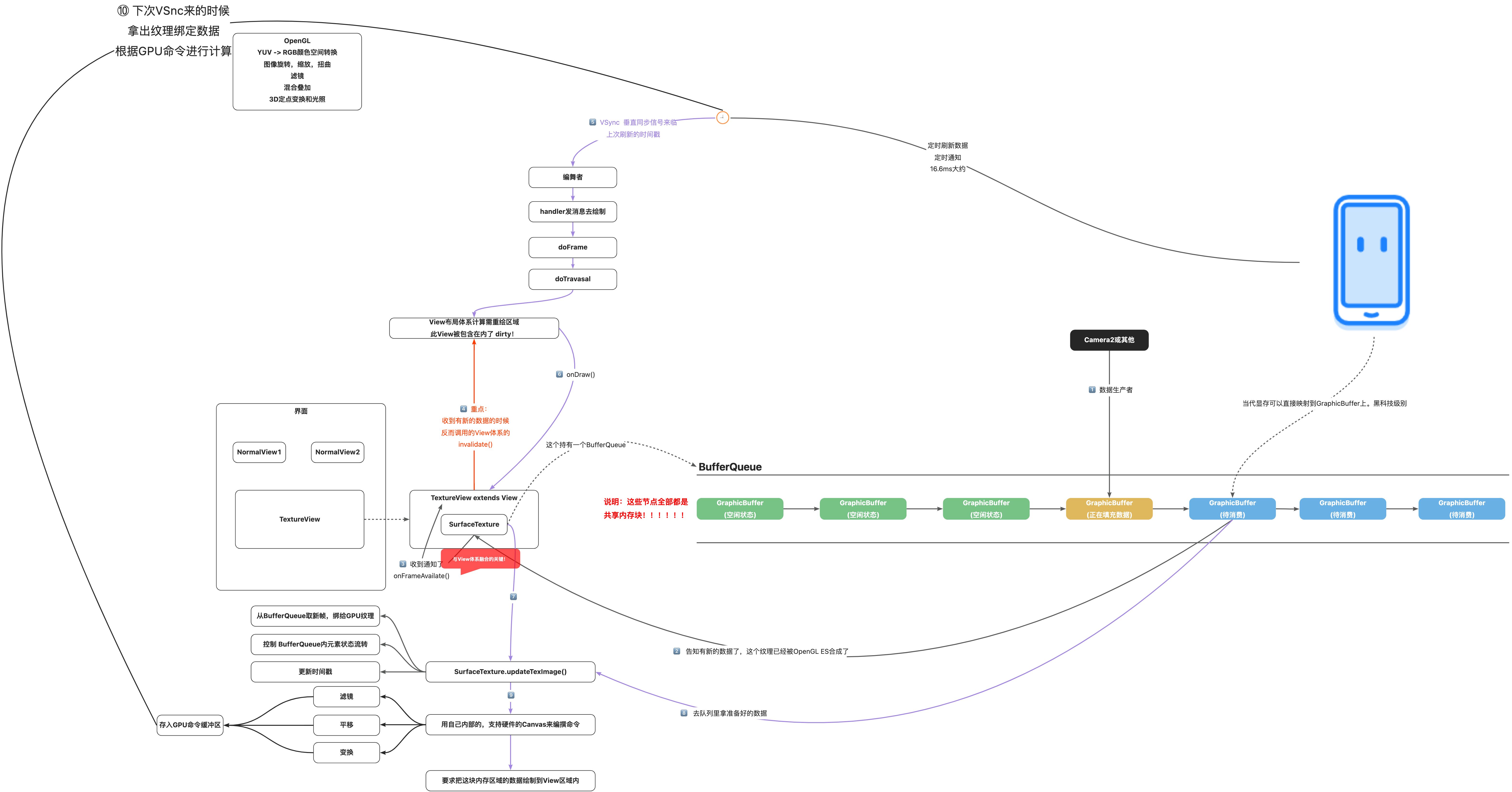 而是将其内容区域内容直接给到了OpenGL ES来处理,你可以理解为越过系统,私绑了OpenGL ES的某些插槽(TetureView中的SurfaceTexture专攻)。有机会讲讲这个OpenGL。具体是这样的流程:
