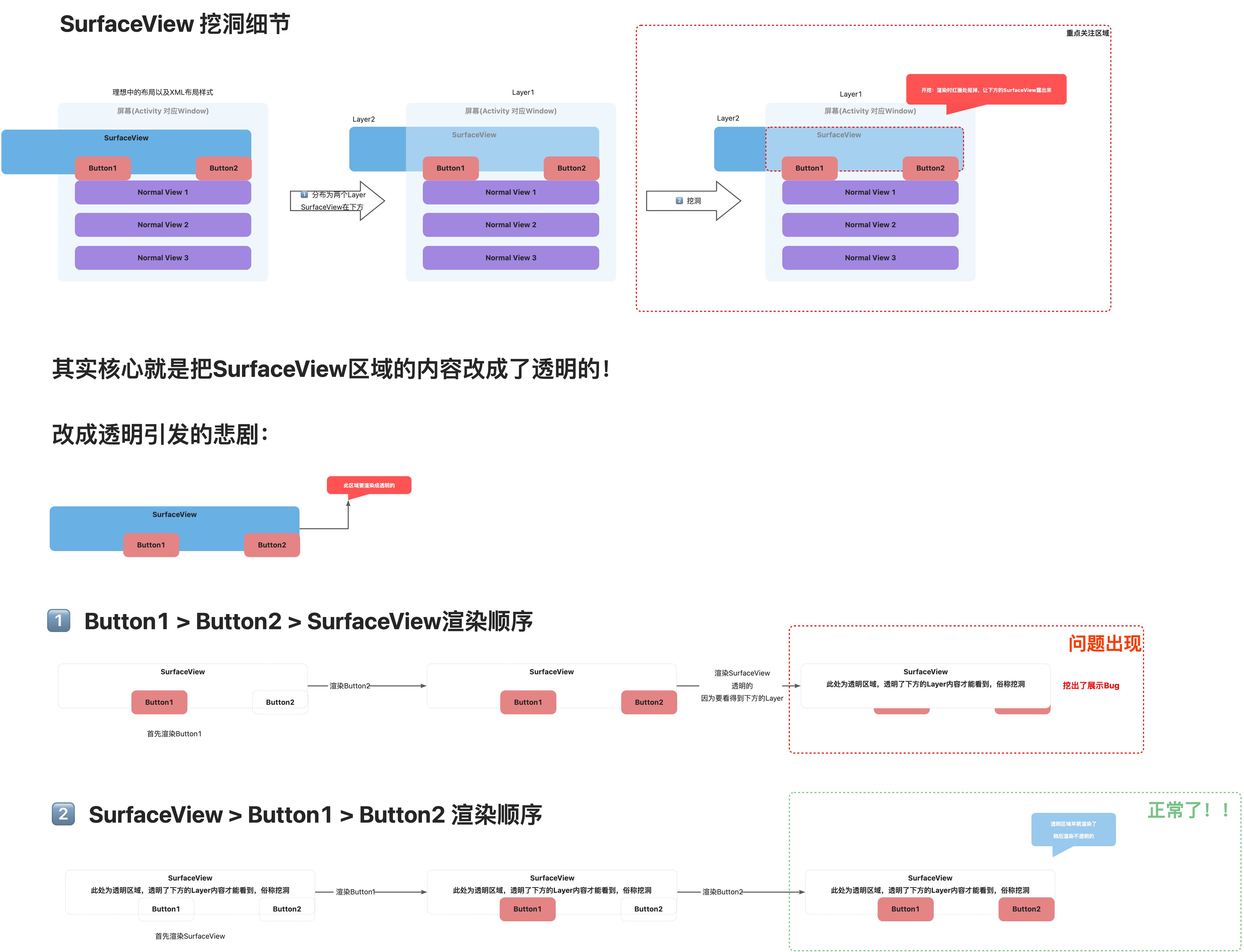 SurfaceView通常用于视频预览,视频播放中。其核心是内部持有Surface。 还有个隐蔽的场景是浏览器的视频播放中,楼主最早做过一个叫H5课件的功能,是用浏览器播放的课件内容,视频播放时就遇见了打洞透穿,导致按钮展示不出来的问题。后来才知道浏览器的视频播放就是SurfaceView做的。SurfaceView用在复杂的界面里,难免会遇到其区域内的控件不可见的问题。对于这个问题现象下图有表示。