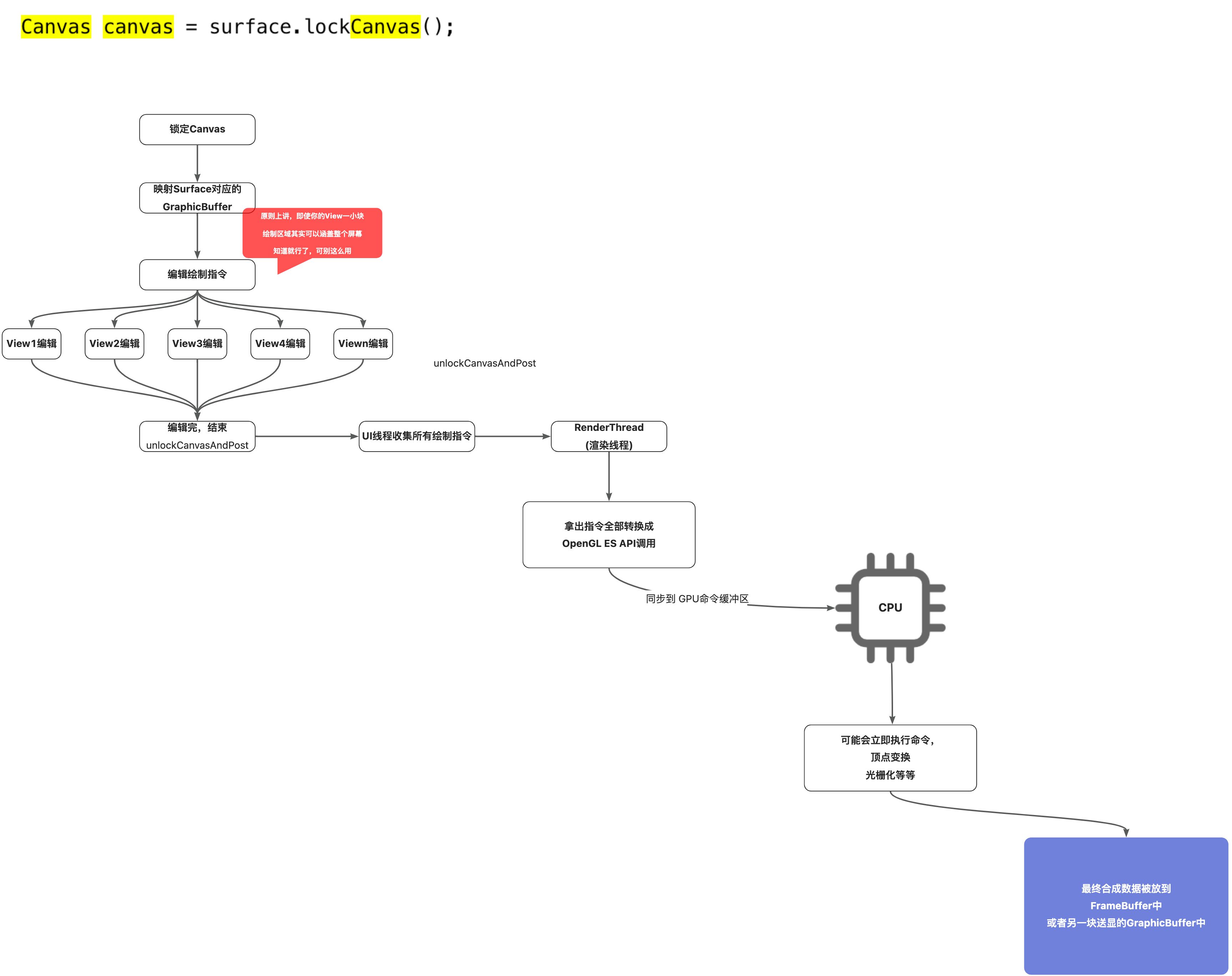 我们可以说,Surface是和OpenGL 高速处理的那些内存区域有关。 但是那些区域怎么处理,其所有涉及到的命令,全部都是用Canvas来编撰的。 RenderThread负责将这些命令翻译成OpenGL 指令。
