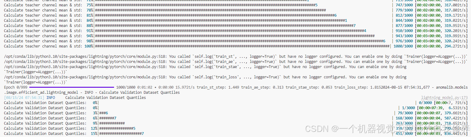 在训练时开启一个代理软件,Anomalib会自动下载ImageNet数据集的。而且下载的不是100多个G的完整数据集,是一个2G左右的数据。这样就可以开启训练啦!官方默认的训练参数是1000个epoch或者70000个step。