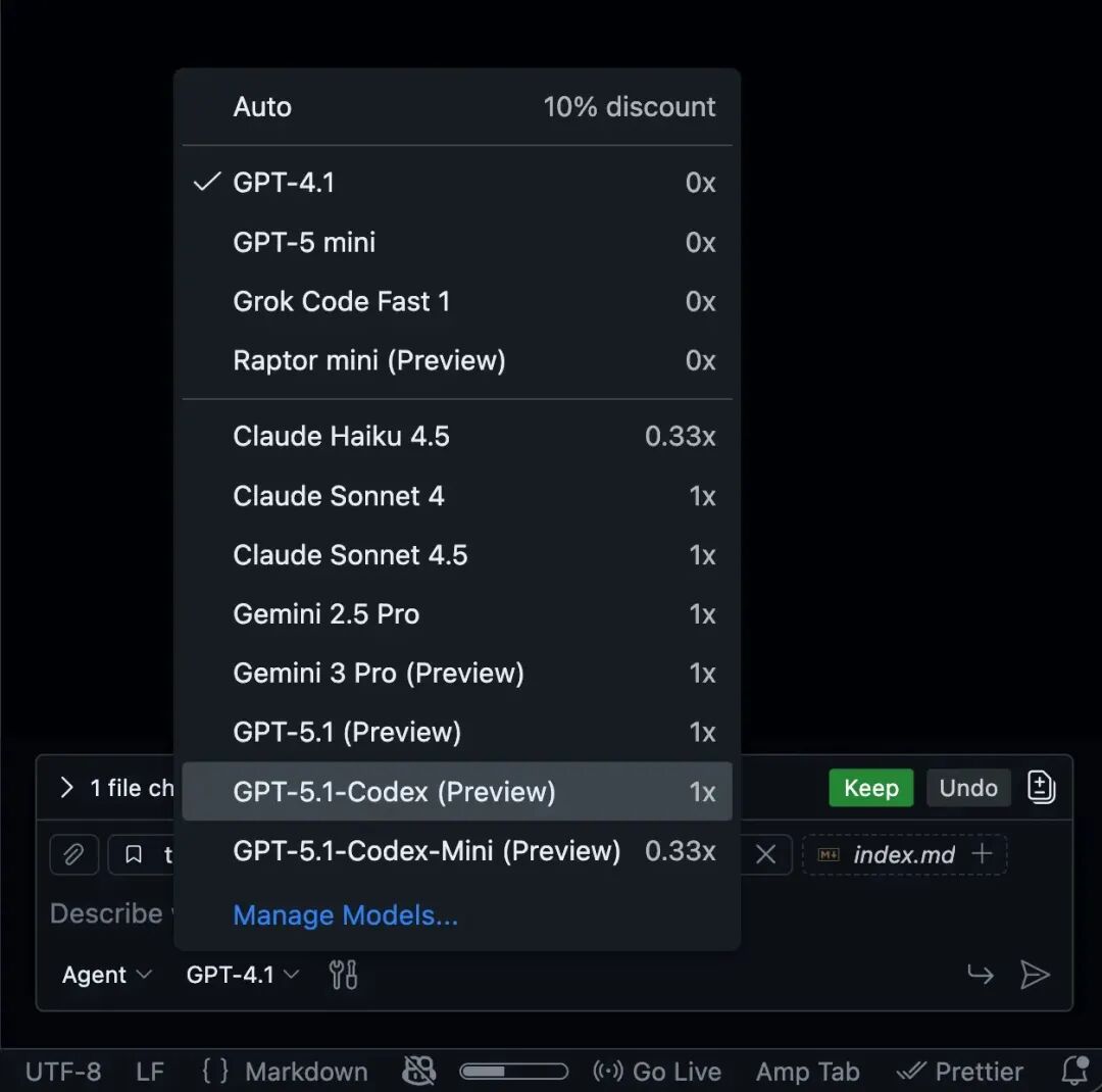• GitHub 为我免费开通了 Pro 账户,虽然每月 premium 调用额度只有 300 次,但是结合其他插件,比如 AMP、Codex、Droid、Qwen 等,可以实现更高效的工作流程。即使将来开通了付费账户,10 美元每月的费用,也在同类产品中具有很高的性价比。