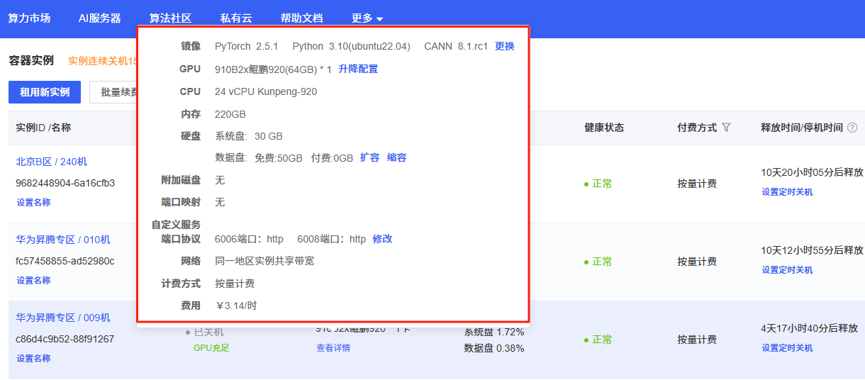 下面图片是我所租的昇腾卡和具体环境版本,太具体的就不说了,有需要的话我单独出一期Autudl租显卡的教程,主要是为了学习昇腾环境如何运行Yolo系列模型。
