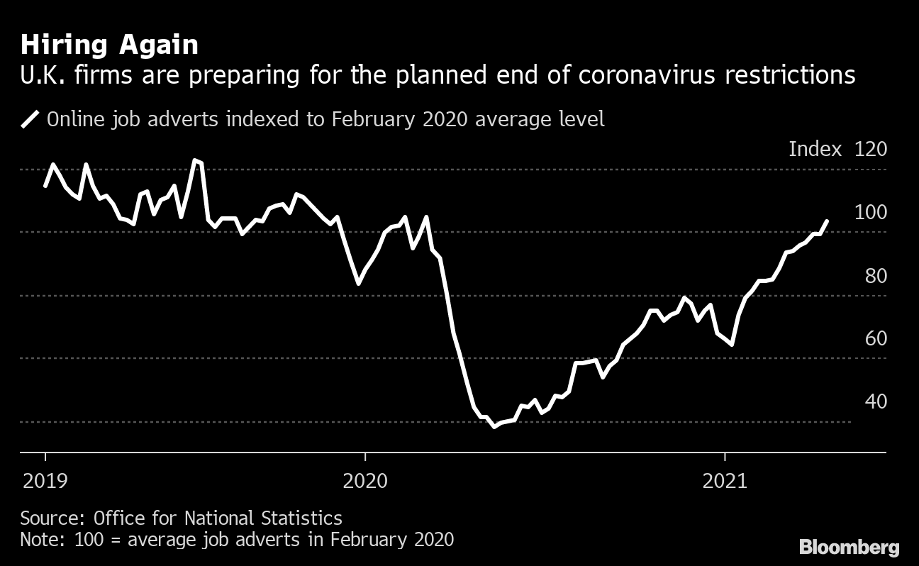 Much has changed in the U.K. since the BOE’s last forecast round in February. The economy took less of a hit than expected in during the lockdowns to control the coronavirus. Analysts surveyed by Bloomberg expect growth of 5.5% this year, above the 5% pace forecast by the BOE in February. Bloomberg Economics expects a 7% expansion.