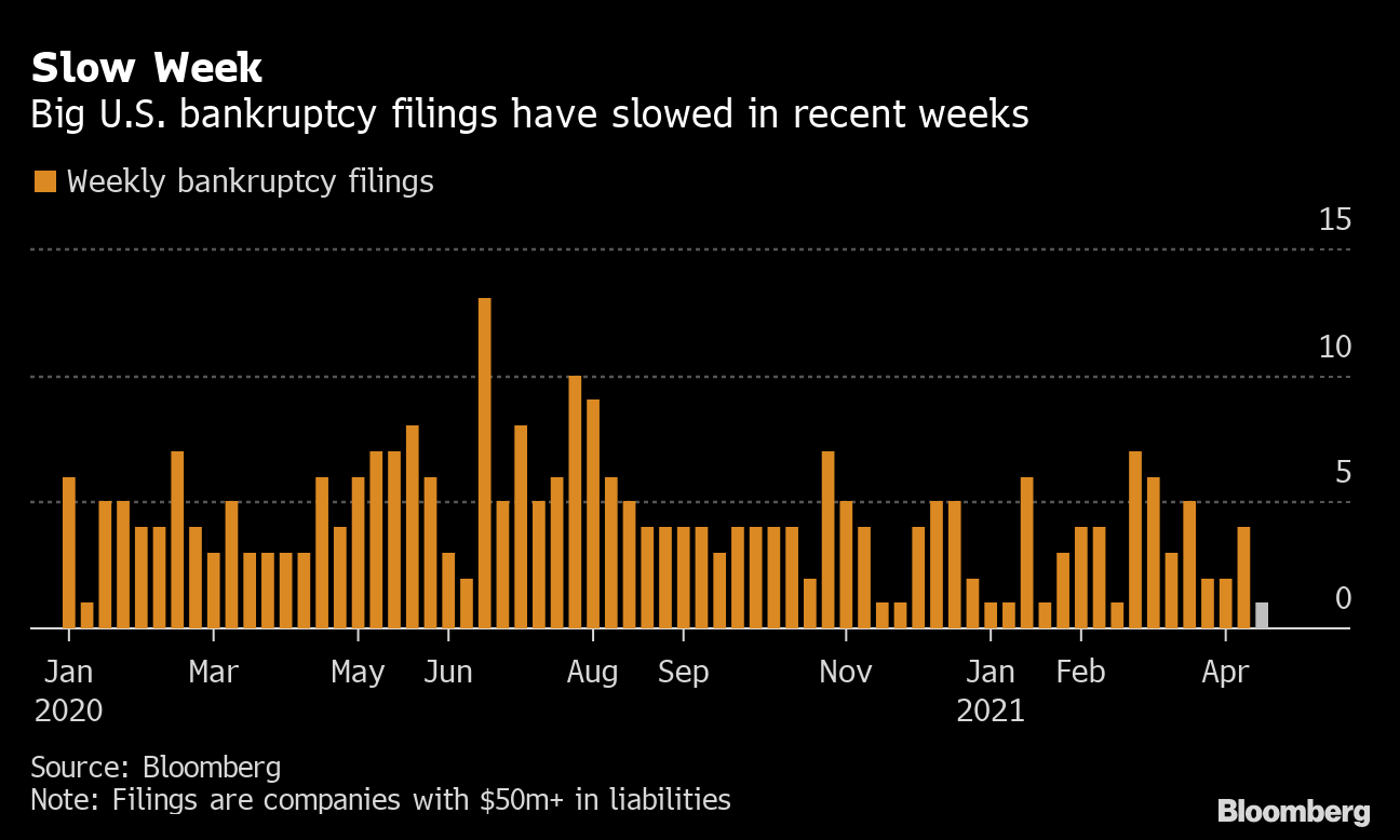 Last week saw just one new bankruptcy filing from a firm with at least $50 million of liabilities, according to data compiled by Bloomberg. Weekly filings have been trending lower since the end of February.